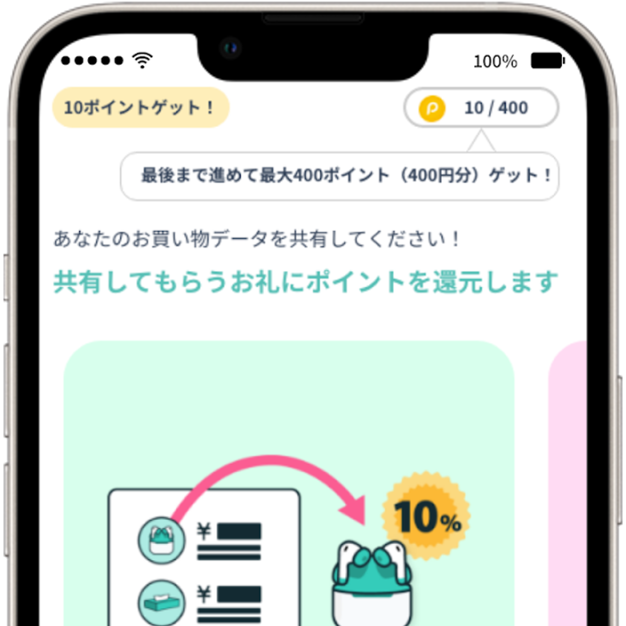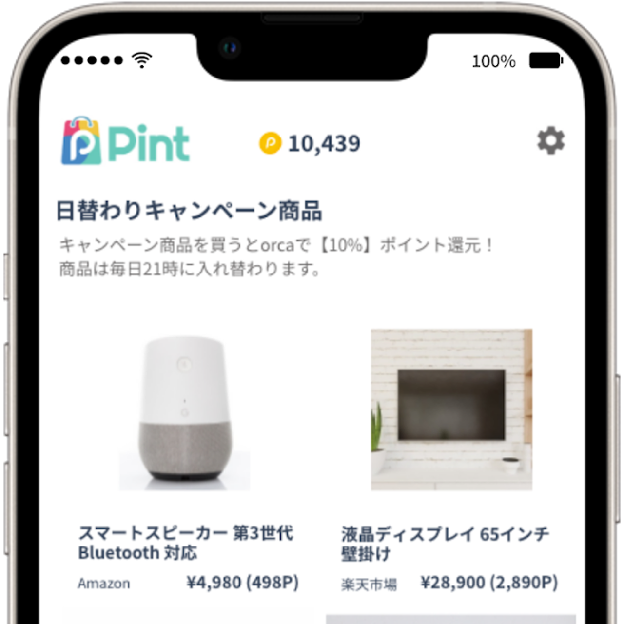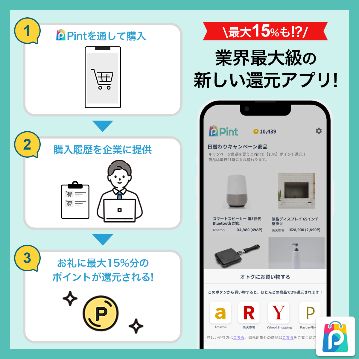 Pint(ピント)では皆さまからお買い物情報のデータをいただき、そのお礼として買い物ごとにポイントを還元します。お買い物情報は皆さまの生活を良くするために活用されます。